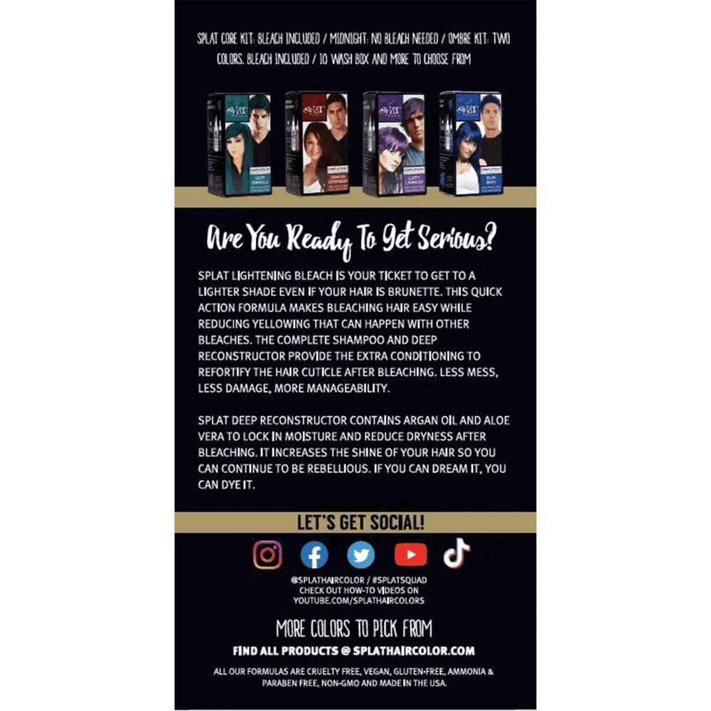 Product Name: Splat Hair Color & Bleach Kit - Lightening Bleach - 5.65 oz (Pack of 12)UPC: 857169020321Description: The Splat Hair Color & Bleach Kit - Lightening Bleach provides everything needed to safely and effectively lighten hair. Each kit contains 5.65 oz of lightening bleach, formulated to lift natural or dyed hair to a brighter shade in preparation for coloring. This pack of 12 kits is ideal for salon professionals, stylists, or at-home users who want consistent, high-quality results for multiple applications.